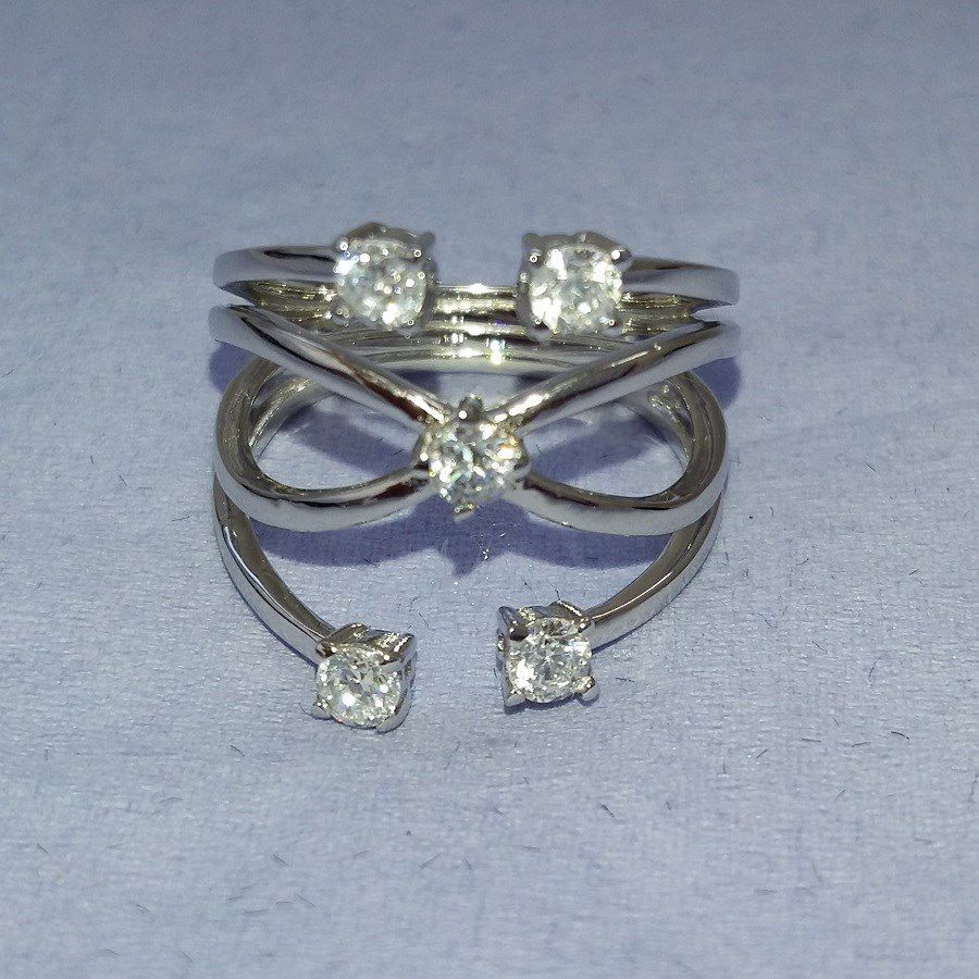 Anel prata banho ródio com trabalhado em dois aros abertos, dois aros cruzados e com cinco pontos de zircônia.Medidas do trabalhado: 1,9 cm de largura.(Obs: Todas as medidas são aproximadas e baseadas nas extremidades maiores do produto).