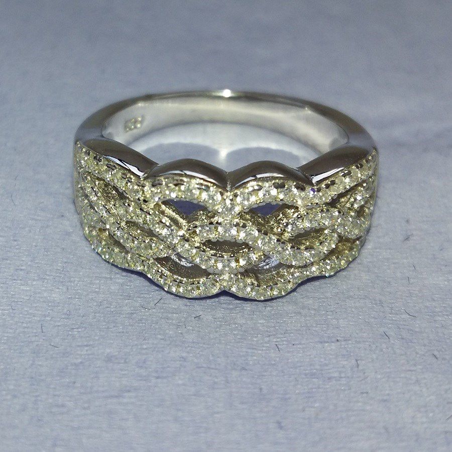 Anel prata banho ródio, meio aro com trabalhado trançado vazado com zircônias.Medidas do Trabalhado: 0,7 mm de largura e somente em meio aro.(Obs: Todas as medidas são aproximadas e baseadas nas extremidades maiores do produto).
