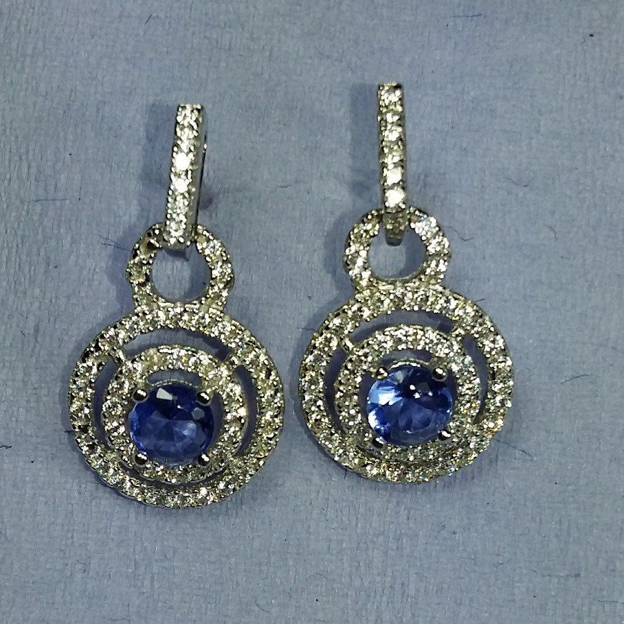 Brinco prata com banho ródio, no centro zircônia azul e dois círculos com zircônias branca.Medidas: 1,8 cm de comprimento e 1 cm de largura.(Obs: Todas as medidas são aproximadas e baseadas nas extremidades maiores do produto).